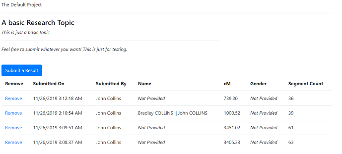 Back on the research topic splash page, you can also view any submitted data. This will include all data submitted by you, as well as any data that has been submitted by other members that have chosen to share with all other members.
